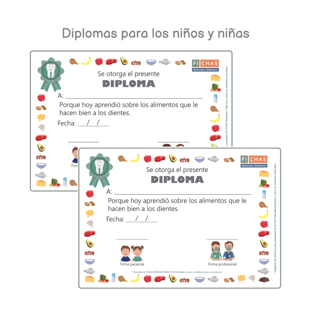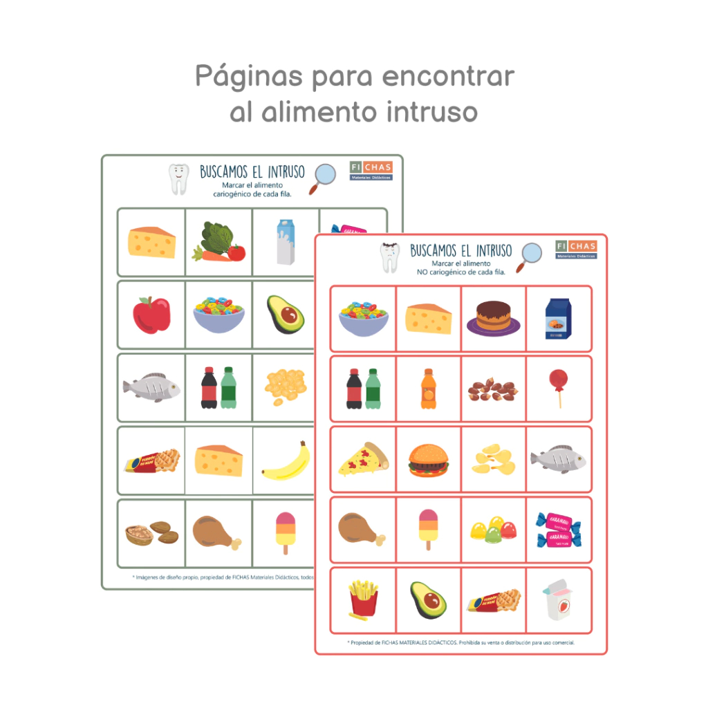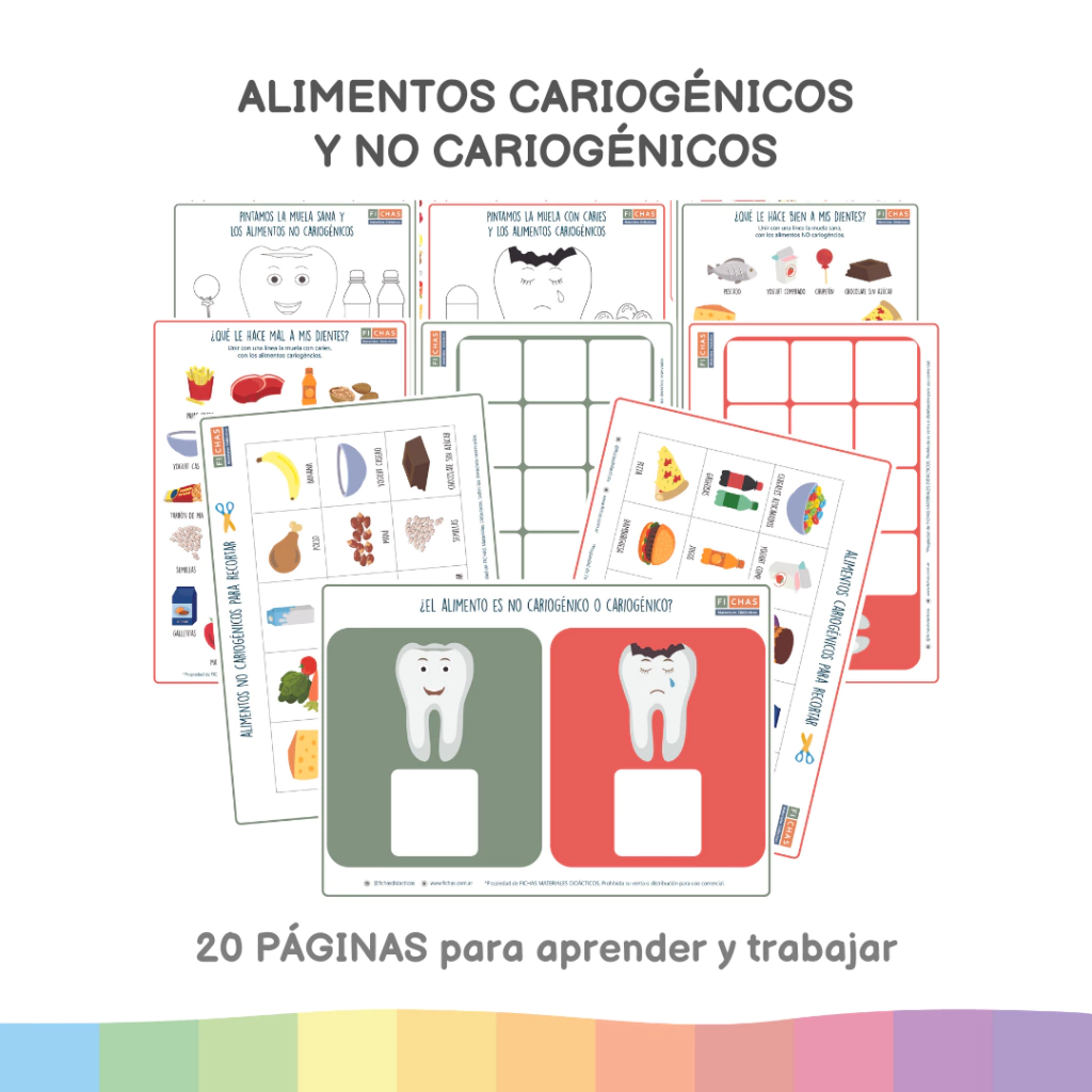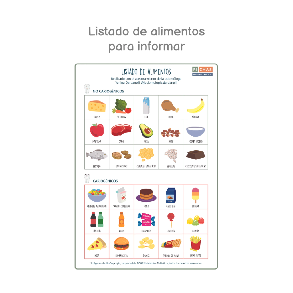 Material para utilizar en consultorio odontológico, pediátrico, de nutrición, terapéutico, jardines o escuelas, para trabajar el reconocimiento de los alimentos cariogénicos y NO cariogénicos y la prevención de la salud bucal.
