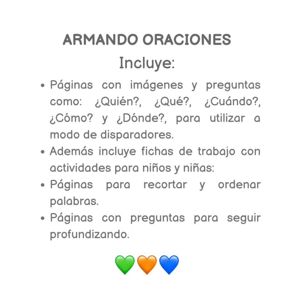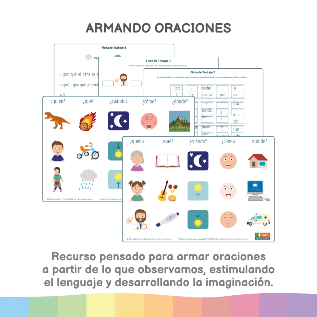Diseñamos este recurso pensado para que los niños y niñas armen oraciones a partir de lo que ven, estimulando el lenguaje y desarrollando la imaginación.