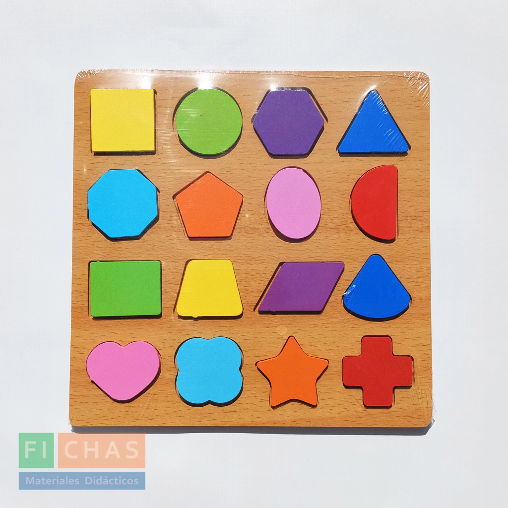 Consta de un total de 16 piezas geométricas coloridas que incluyen diferentes formas, lo que permite a los niños aprender a reconocer y clasificar.