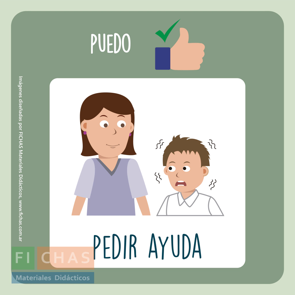 Trae una imagen central con el apoyo visual de la conducta adecuada o inadecuada y debajo la palabra escrita, dentro de un recuadro verde con la palabra "puedo" y el pulgar para arriba, o rojo con las palabras "no puedo" y el pulgar para abajo, a modo de refuerzo.